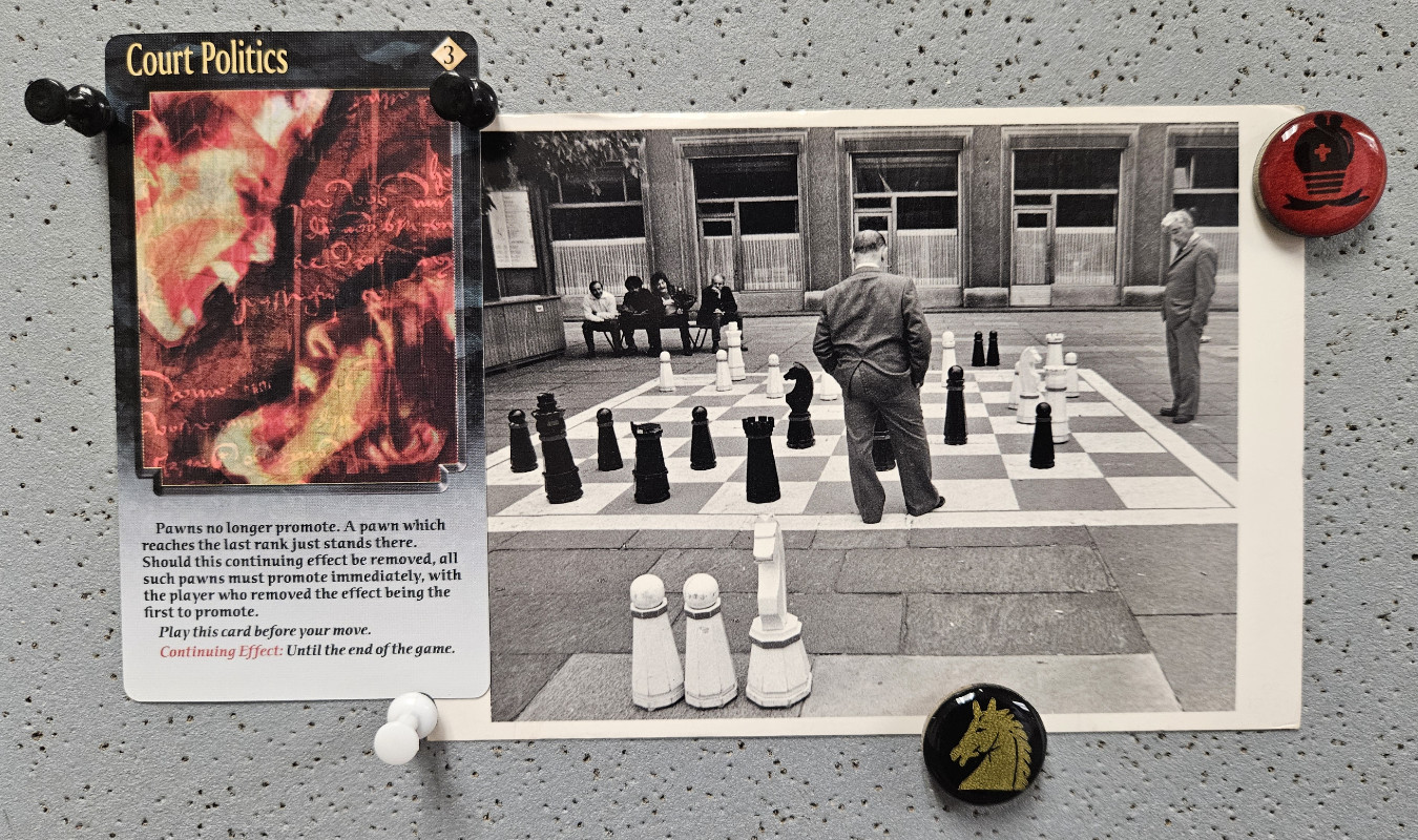 Card: "Court Politics" (Rogério Vilela, 2014), from Knightmare Chess (3rd Edition), published by Steve Jackson Games.