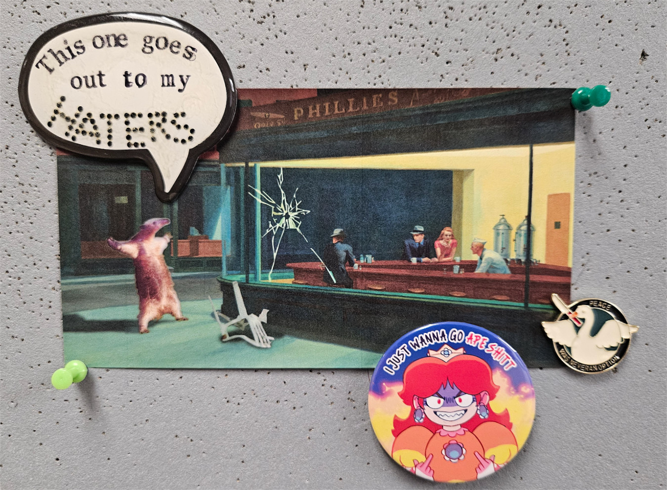 Choosing Rapid EscalationApril 8, 2026 Greg Jensenart birds cohost diaspora critters cutouts pins video gamesHow dare you tell me I can't flip this table?!Cutout credit: "I Am The Night(hawks at the Diner)" (Anonymous, 2008).Pins:Doodlemancy.Untitled Goose Game.Made in-house.Read other posts← Looks Just Like Candy! Should This Treasure Be... Breathing? →
