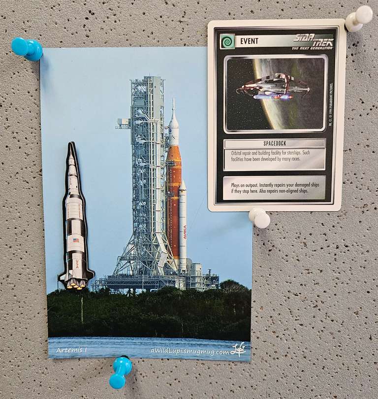 Eager To Leave The NestNovember 1, 2025 Greg Jensencohost diaspora objects photography space trading card games vehiclesLeave the comforts of the scaffolding behind and spread your wings!Postcard credit: "Artemis I" (Lupi, 2022).Magnet: Bendon Space Exploration Science.Card: "Spacedock" from Star Trek Customizable Card Game (1994), published by Decipher.Read other posts← Candied In Cold Blood Yeah, I've Had Some Work Done. Isn't It Great? →