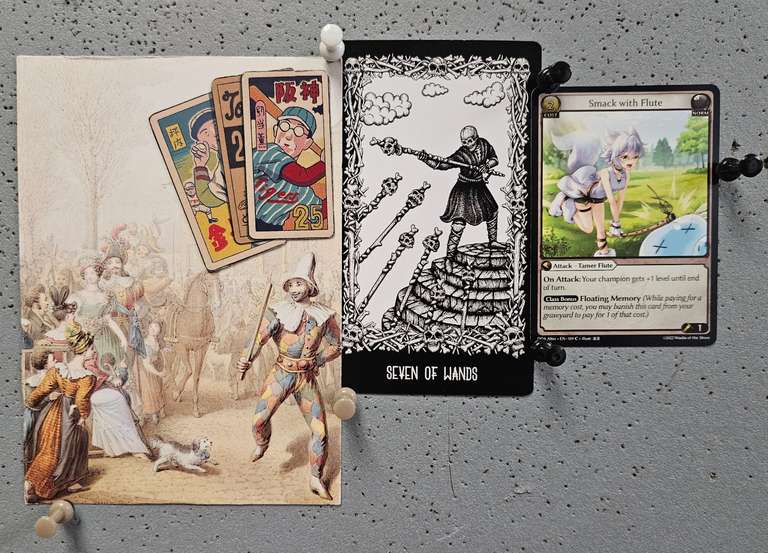 - "Seven of Wands" (Yury Skorohod, 2024), in Alleyway Tarot, originally in the Darkside Skeleton Tarot.