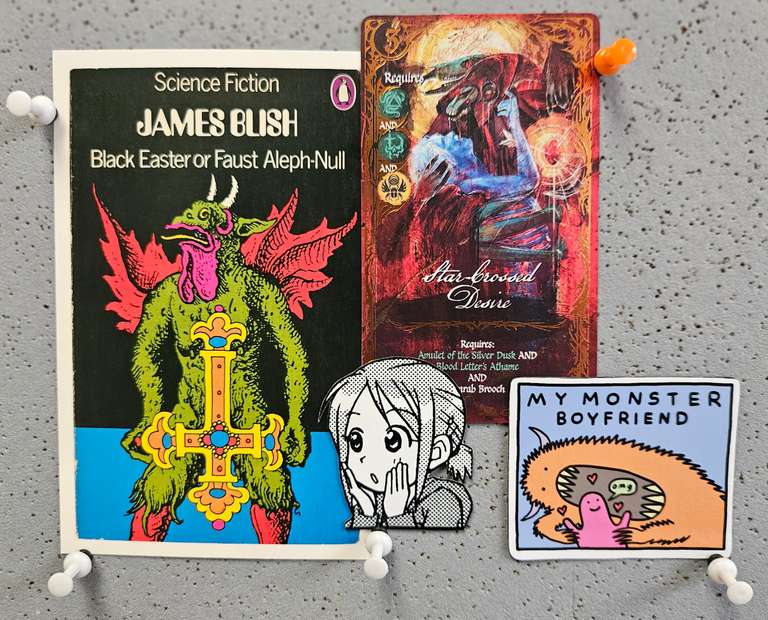 Postcard credit: Black Easter or Faust Aleph-Null (James Blish, 1968; cover by Peter Lord, 1968).