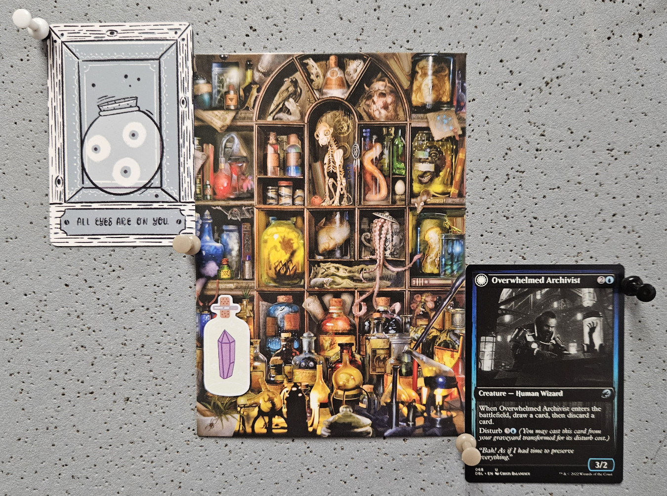 - "Overwhelmed Archivist" (Cristi Balanescu, 2022), from Magic: The Gathering - Innistrad: Double Feature, published by Wizards of the Coast.
