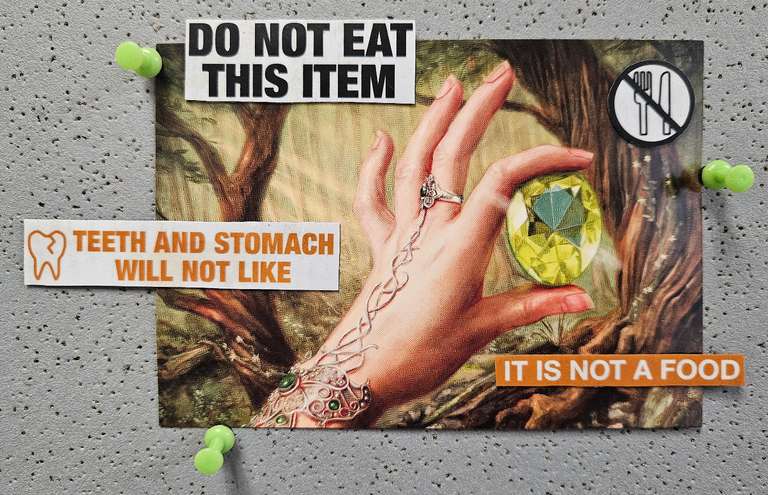 Looks Just Like Candy!April 7, 2026 Greg Jensenart merch postcards stickers webcomicsIt's pretty to look at, so surely it must be safe to ingest! (Geez, who put all these labels on this thing?)Postcard credit: "Moss Diamond" (Lindsey Look, 2014).Stickers: David Malki, purchased from Topatoco.Read other posts← Mock Tooter
