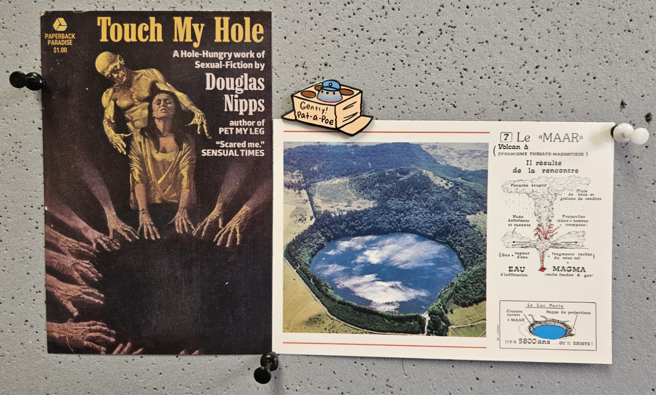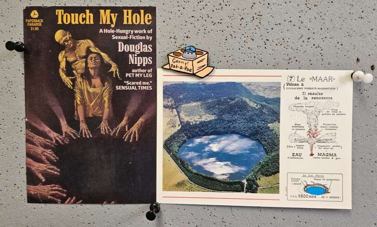 Plumbing The DepthsOctober 2, 2025 Greg Jensenart birds cover art photography pins postcards robots"It results from the encounter!"Postcards:Photo (H. Monestier, 1986) and illustration (Pierre Lavina, 1986) of Le MAAR.Touch My Hole (Paperback Paradise).Pin: Flea Circus.Read other posts← Doing Your Toothsome Duty There's Always A Bigger Mouth →