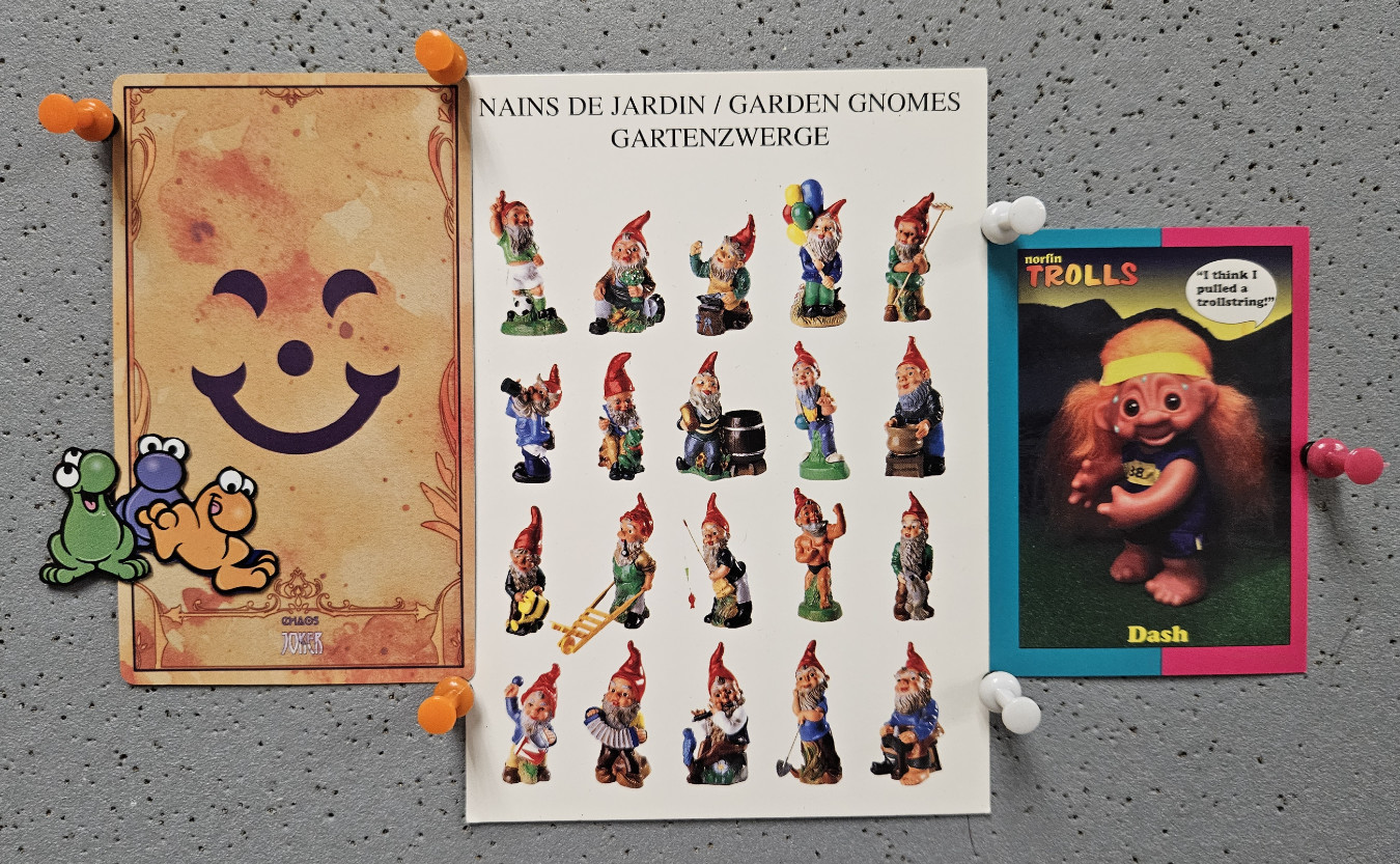 Postcard credit: "Garden Gnomes" (Photo by Michel Viard, 1997).
