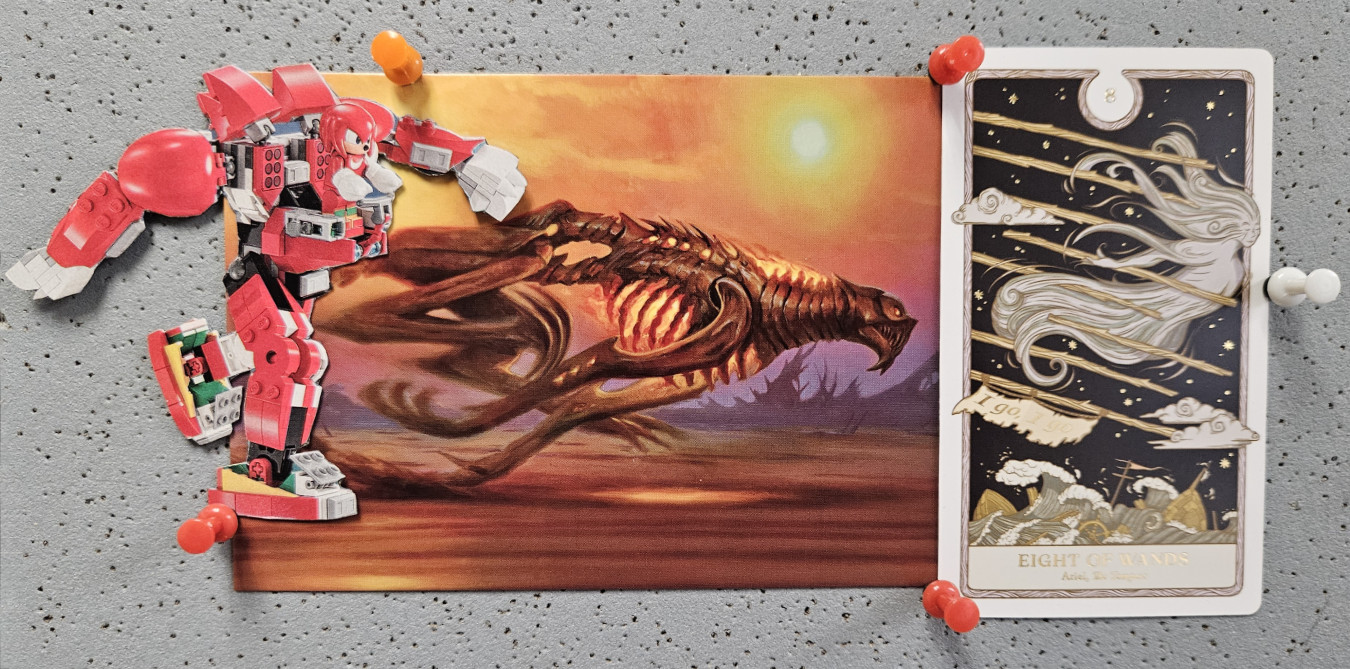 Card: "Eight of Wands: Ariel, The Tempest" (Eunice Choi, 2024), in Alleyway Tarot, originally in the Bard's Arcana.
